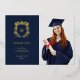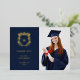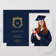These simple and elegant graduation thank you cards feature a gold foil crest with your monogram in the centre, and modern gold foil text on a dark, navy blue background. There is a spot to add your grad photo, plus room for a personal message on the back. A classy and modern look for the graduate.