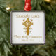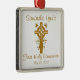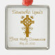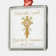 A beautiful golden floral cross square silver framed ornament. The front features a lovely golden cross with floral accents on a white background which is framed in a round silver look edge or frame. The front also provides a template area ready for you to add your child's name and date of their communion. The back of the ornament is silver, and it hangs from a lovely satin red ribbon. A wonderful First Communion favour gift item for your celebration party! This design is available on different shapes of ornaments in our shop. We also offer matching invitations, stamps, table number cards, seating cards, gift items and more! Please visit us for other religious, spiritual, and celebration party items.