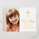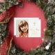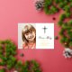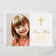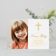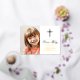 Announce your child's special day with this Minimalist Golden Cross Holy First Communion Photo Real Foil Invitation. The design features real foil Christian golden cross on a clean white background. Your child’s photo is placed beside the event details, creating a modern and elegant layout. Ideal for boys or girls, this invitation is easy to personalise.