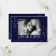 This elegant wedding save the date card features modern, silver script typography and accents with your favourite personal photo, on a dark, navy blue background.
