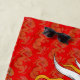 Golden dragon on red patterned background.