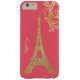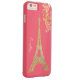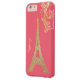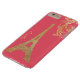 Glam iPhone 6 Plus case, with a glitzy looking gold tone glitter looking silhouette of the Eiffel Tower, against a coral pink background. Personalise the yellow gold text, for yourself or as a great gift idea.