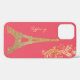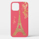 Glam iPhone 12 case, with a glitzy looking gold tone glitter looking silhouette of the Eiffel Tower, against a coral pink background. Personalise the yellow gold text, for yourself or as a great gift idea.