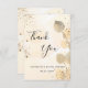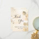 A Bridal Shower thank you card. A golden watercolored background decorated with golden eucalyptus and faux gold glitter dust. On front large black coloured hand lettered script and the text: Thank You, your text, title and a date.