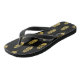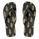 Flip flops featuring an elegant repeat pattern of glamourous gold feathers on a sleek black background. A stylish expression of individuality.