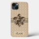 Personalised Name Gold Fleur De Lis iPhone 13 Case - Elegant cream coloured damask pattern background with a chic trendy Fleur De Lis / Fleur De Lys embellishment and custom name template at the bottom.