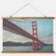 The San Francisco iconic Golden Gate Bridge stands tall against blue sky at sunset.