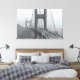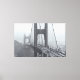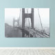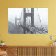 A black and white photograph captures the iconic Golden Gate Bridge shrouded in fog. The bridge's steel structure, with its distinctive red paint, stands out against the hazy background. The suspension cables, stretching from the towers to the roadway, create a sense of depth and scale. The fog adds a mysterious and ethereal quality to the scene, obscuring the surrounding landscape.