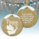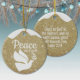 Golden Glitter Christmas Luke Bible Verse ceramic tree ornament, Dove Peace Symbol adorned with shimmering gold and a pristine snow cap that embodies the wonder and serenity of the holiday season. The front features a graceful "Peace On Earth" divine message, complemented by the back inscription: "Glory to God in the highest, and on earth peace, good will toward men - Luke 2:14," verse in white editable text for your cherished Bible scripture. Meaningful devotional hanging piece that celebrates faith with a yuletide design. Perfect for seasonal hanging displays, christian decor, faith keepsakes or thoughtful Xmas presents, this inspirational memento infuses your festivities with sacred messages from the teachings of our Lord. Secure yours now and illuminate your celebrations with heavenly elegance!