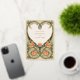 This Golden Heart Art Nouveau Wedding Invitation is a romantic tribute to love, artfully blending cream, sage green, and warm orange tones with golden foil accents. The front of the invitation showcases an intricate heart-shaped design, composed of elegantly stylised floral and leaf patterns, which tenderly frames the names of the couple. The design is bordered by a graceful gold foil outline that adds a touch of luxury. On the back, the heart motif is continued, enclosing the wedding details in a loving embrace. This design captures the essence of Art Nouveau with its flowing lines and natural forms, making it an ideal announcement for couples who desire a touch of vintage elegance on their special day.