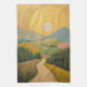 This serene landscape painting depicts a winding path leading through a lush, verdant valley toward distant, rolling mountains. The most striking element is a magnificent, radiant sun that dominates the upper half of the canvas, rendered in circular, sweeping brushstrokes of shimmering gold and soft ochre. The foreground is filled with dense, dark green evergreen forests and gentle hills in shades of mustard yellow, moss green, and a singular pop of dusty rose. The overall atmosphere is one of tranquil exploration, combining a folk-art sensibility with a rich, metallic texture that makes the sky appear to glow with eternal light.