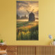 A breathtaking digital painting capturing a rustic wooden windmill standing tall in a misty meadow at sunrise. Bathed in warm, golden light piercing through dramatic clouds, the scene glows with serene beauty — wildflowers in vibrant reds and yellows bloom in the foreground, while distant evergreens fade into soft fog. The textures of weathered wood, dew-kissed grass, and luminous sky create a nostalgic, peaceful countryside moment perfect for bringing tranquillity and timeless charm to any home or office.