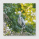A grey heron perches gracefully on a tree branch, surrounded by a mix of green and golden leaves. The soft bokeh in the background enhances the peaceful atmosphere, highlighting the bird’s elegant posture and striking feathers in an autumn setting.