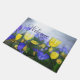 Sunny yellow and blue tulips stand out in a field on a cool, misty spring morning. In the early sunlight they stand out like golden cups of light.