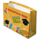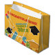 Cute Kindergarten graduation gift bag. School bus yellow background with graphical school supply icons. Modern whimsical typography in multiple colours pulling from card details. Sophisticated yet youthful.