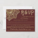 Elegant Reply (RSVP) card based on an original digital painting by Leslie Sigal Javorek that gives the illusion of gold lace on a cordovan background. Inspired by some amazing Henna Tattoos created by women in India. Personalise the text & choose paper type (may affect colour and sharpness of details).