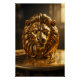 Photorealistic close-up of a polished, opulent golden lion head with a flowing, intricately detailed mane. Deep reflective eyes and mirror-like metallic surfaces catch the light, highlighted by dramatic studio lighting. The lion rests on an ornate golden tabletop with subtle engraved patterns, creating a majestic, luxurious, and cinematic esthetic. Ultra-detailed, sharp focus emphasizes the richness and elegance of the metallic textures.
