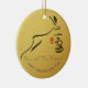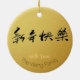 Original ink painting style of a bouncing rabbit by RB + black "2023" (original hand writing) + small ancient Chinese ideogram for rabbit in a red shape+ customizable "Happy Chinese New Year" and golden "Year of the Rabbit" onto a golden textured paper (image printed) as background + wishes in Chinese and message with Family name to customize in back. You can easily change "Happy Chinese New Year" (font, color, size and position) by clicking the customize button. Design on round ceramic ornament. Matching greeting card, holiday postcard, sticker and more... Perfect for Chinese New Year of the Rabbit 2023 or birthday (people born in Rabbit Year).