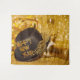 Gold sparkles and streamers, champagne bottle, and a black hat with gold lettering to ring in the New Year.