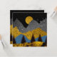 Abstract mountain landscape design in bold shades of gold, black, and blue with a moonrise and birds.