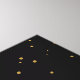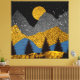 Abstract mountain landscape design in bold shades of gold, black, and blue with a moonrise and birds.