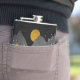 Abstract mountain landscape design in bold shades of gold, black, and blue with a moonrise and birds.