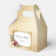 Create an unforgettable winter wedding with this elegant holiday favour box design featuring a lush spray of Christmas roses, poinsettia, holly and pine, white labels with ornate gold borders on an opulent faux metallic gold gradient damask pattern background. Includes editable text fields.