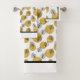 A Gold And Black Bath Towel Set Patterned In Golden Orbs And Black Leaves On White