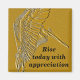 A pelican with it's wings out wide in gold art.
