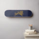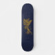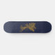 a decorative golden lineart design of a rising phoenix bird on a dark blue coloured skateboard