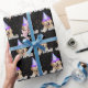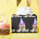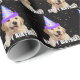 Cute golden retriever with birthday party hat and colourful confetti on black background.