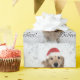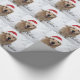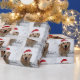This wrapping paper features a photograph of a cute golden retriever dog who is wearing a red Santa hat and is surrounded by snow. The text reads, "Believe."