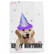 Cute golden retriever with a birthday party hat, black text and colourful confetti on white background.