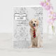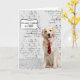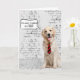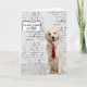 Golden retriever with speech bubble, red and black striped necktie, on brick for getting older birthday.