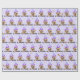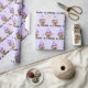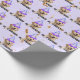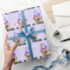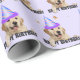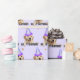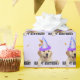 Cute golden retriever with birthday party hat and gold confetti on lavender purple background.