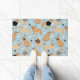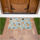 Cute Golden Retriever dogs with dark and light coats sit and stand with scattered dog bones and pawprints on a blue background.
