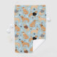 Cute Golden Retriever dogs with dark and light coats sit and stand with scattered dog bones and pawprints on a blue background.