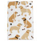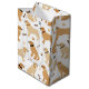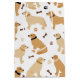 Cute Golden Retriever dogs with dark and light coats sit and stand with scattered dog bones and pawprints on a white background.