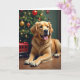 A nostalgic and tender Christmas painting of a Golden Retriever watching a toy train beneath the Christmas tree. A timeless holiday artwork that brings warmth and joy to any home.