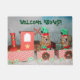 This door mat feature golden retrievers dressed as elves riding on a Christmas train. They are ready to deliver presents for Christmas. The text reads, "Welcome Aboard!".