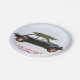 Golden retriever driving retro car in snow with green Christmas pine tree on roof top