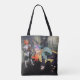 This all over tote bag features golden retrievers dressed as fire breathing dragons fighting a knight.