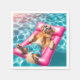 A golden retriever dog lounges on a pink inflatable air mattress in a swimming pool while wearing sunglasses and blue swim trunks decorated with pink flowers