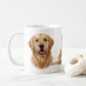 This high-resolution 11oz full wrap Golden Retriever mug design features a beautifully realistic dog portrait blended with a full-body pose for a seamless left-to-right layout. Soft natural lighting, a clean white background, gentle shadows, and subtle paw-print accents create a refined and elegant look.