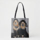 This tote bag features golden retrievers dressed in the goth style. They are dressed all in black with black wigs and spiked collars.
