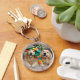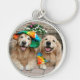 Feeling groovy? This keychain features two golden retriever dogs outside, smiling and wearing wearing tie-dyed clothing.