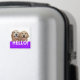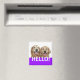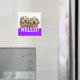 This magnet features a photograph of two smiling golden retriever dogs, with the word HELLO! on a purple background.