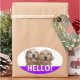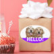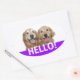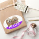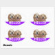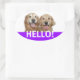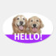 Say Hello! These stickers features a photograph of two smiling golden retriever dogs, with the word HELLO! in white on a purple background.