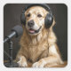 A golden retriever is hosting a podcast while using a microphone and wearing headphones