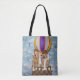 This tote bag features golden retrievers dressed as hot air balloon pilots flying through the sky on their hot air balloon.
